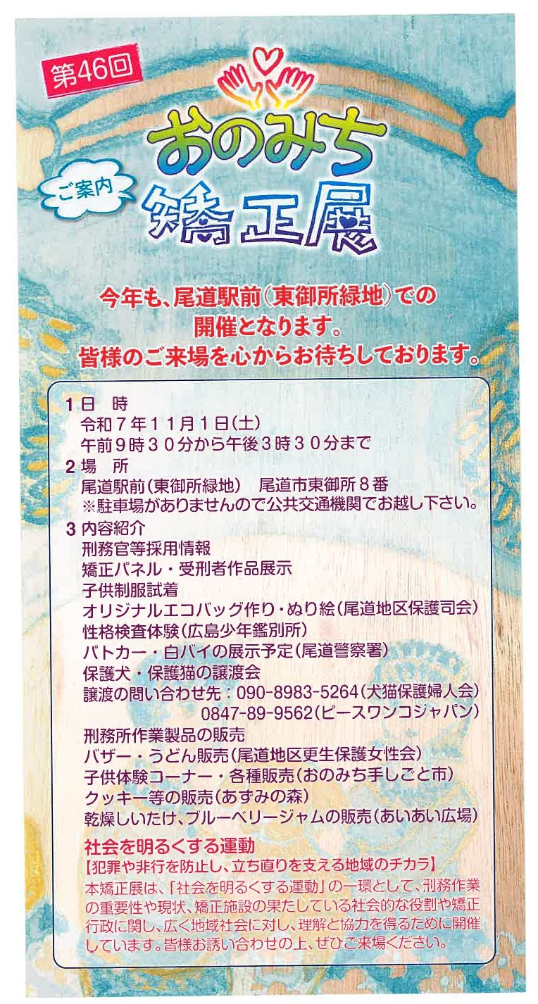 「おのみち矯正展」といって、受刑者の社会復帰に向けての展示会です。施設処遇の紹介や刑務作業品の展示・販売などが予定されています。